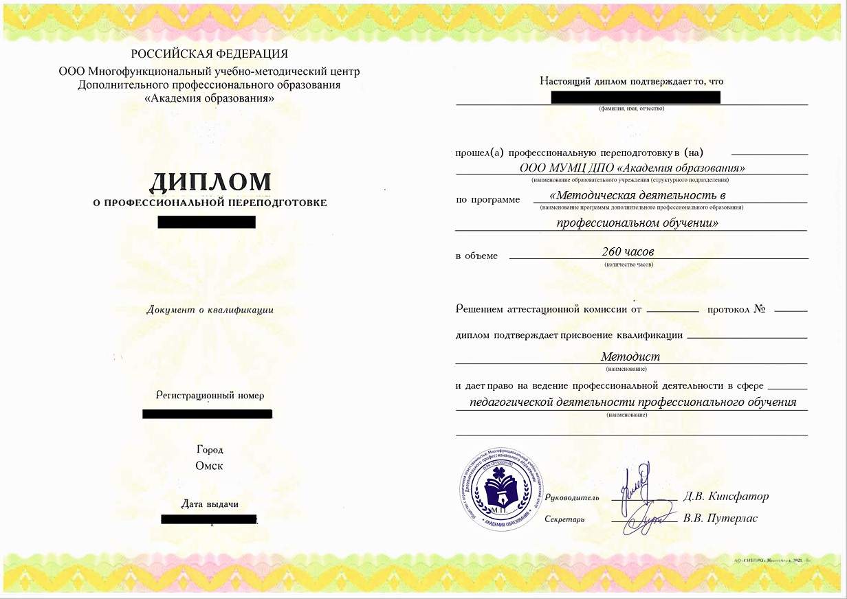 • Диплом о профессиональной переподготовке установленного государством образца. Срок действия: бессрочно